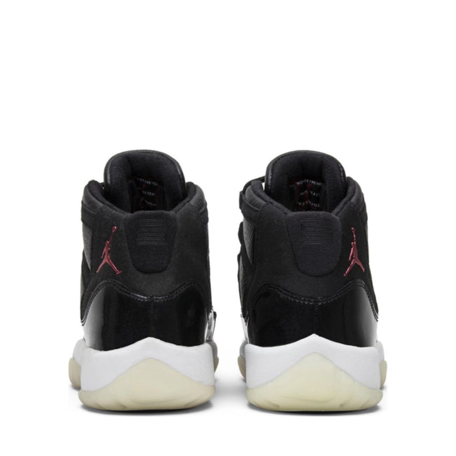 エア ジョーダン 11'72-10' は、2015 年 12 月に大人用と小学生用の両方のサイズで店頭に並びました。このシューズは、シカゴ・ブルズの忘れられない 1995-96 年の Nba シーズンを記念したもので、チームは 4 回目の NBA チャンピオンシップ優勝までに記録的な 72 勝を挙げました。従来のメッシュ構造の代わりに、真っ白なミッドソールと半透明のアウトソールの上に、パテント レザーとタンブル加工を施したブラック レザーを組み合わせています。その他のディテールには、かかとにエンボス加工されたジャンプマンと、ブルズの歴史的な業績を強調する特別なタグが含まれます.air Jordan Jp