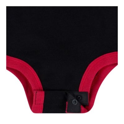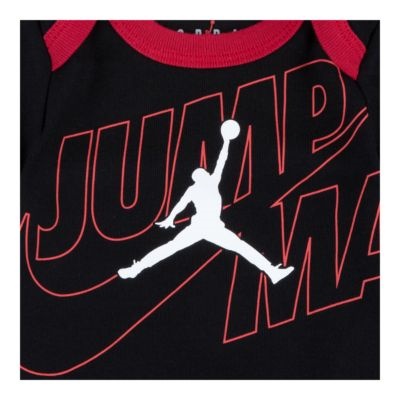 クルーネック、半袖、ラップショルダー、股下スナップ留めのソフトニットボディスーツ。毎日の快適さのための伸縮性のあるブーティーカフ。ボディスーツに Jordan Jumpman By Nike のプリント、帽子とブーティに Jordan Jumpman の刺繍。